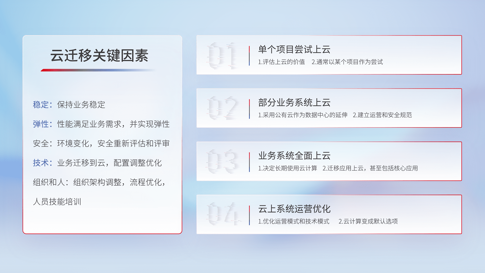 结合实际业务,,,从规划设计、、、、云平台选型、、云原生改造、、、、数据迁移、、、、集成交付,,,迁移全过程为客户识别最佳上云路径,,做好风险识别管理,,,,设计网络架构、、、、身份权限、、、、安全审计合规、、操作审计、、、、日志审计、、、、监控告警策略、、、、多站点容灾设计等,,,,对云上基础设施进行整体规划,,,,提升IT治理水平,,,以满足弹性、、、、高可用、、、、高性能的需求。。