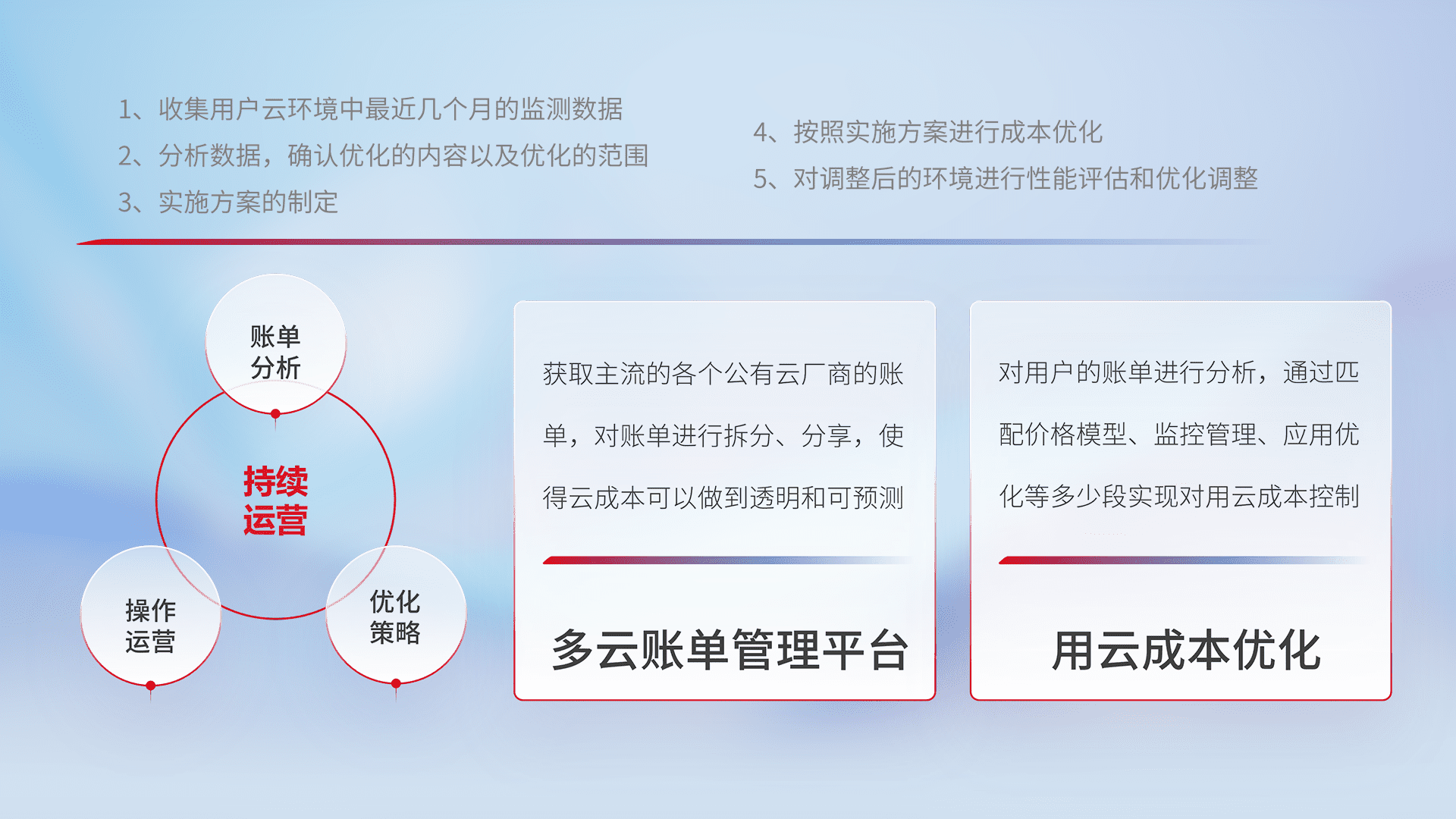 通过多云纳管,,以统一的资源数据模型把客户的云资源进行抽象和封装,,进而实现对多云资源的统一操作,,,,保障云资源管理的可靠性、、、、稳定性与可用性。。。。量身定制化运维内容,,,配置、、开发运维、、、补丁管理、、、备份、、、监控、、认证和访问管理、、审计和日常巡检等,,保障在用云过程中的可靠度,,稳定度以及高可用率。。